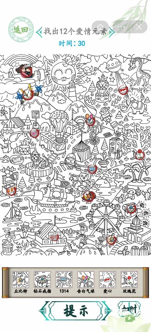 8、游戏宝小编带来汉字找茬王爱情荷尔蒙攻略 ,1314。喷泉左侧下方 ,大海盗船左侧520 。砖石戒子 。
